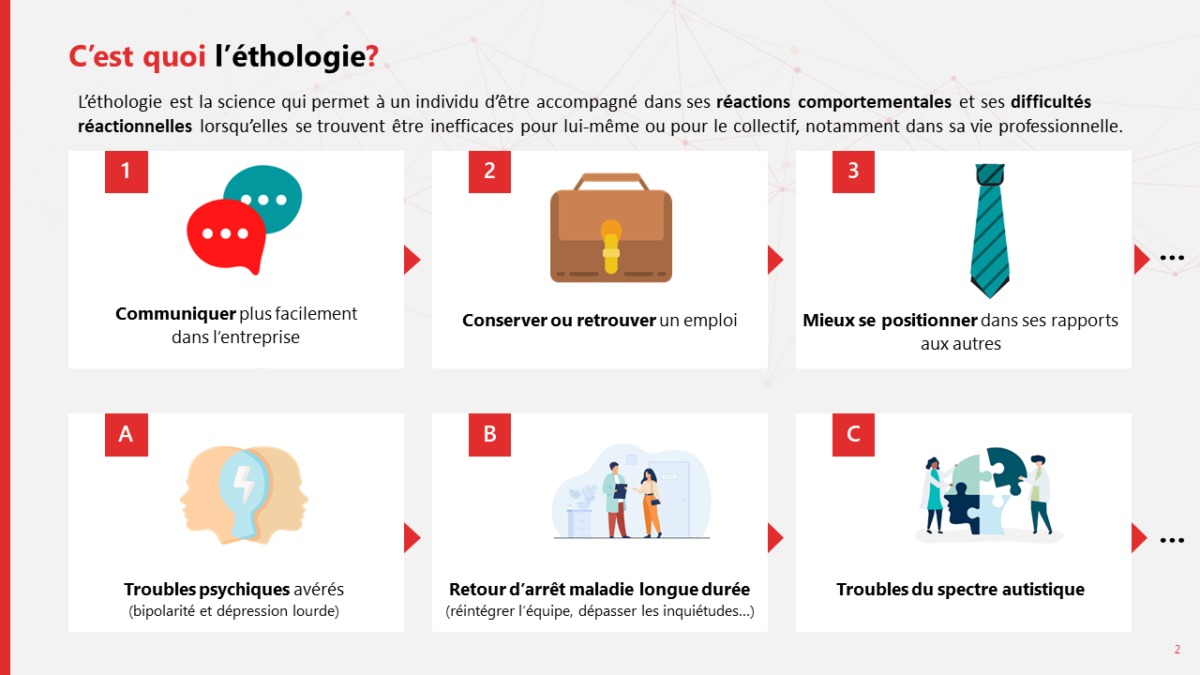 Encore méconnue, l'éthologie est la science qui étudie le comportement des êtres vivants, animaux ou humains. Elle permet d'accompagner un individu dans ses réactions comportementales et ses difficultés réactionnelles lorsqu'elles se trouvent être inefficaces (voire néfastes) pour lui-même ou pour le collectif, notamment dans sa vie professionnelle. Le travail de l'éthologue est de reconnecter le comportement d'un individu à ses besoins et à son environnement.