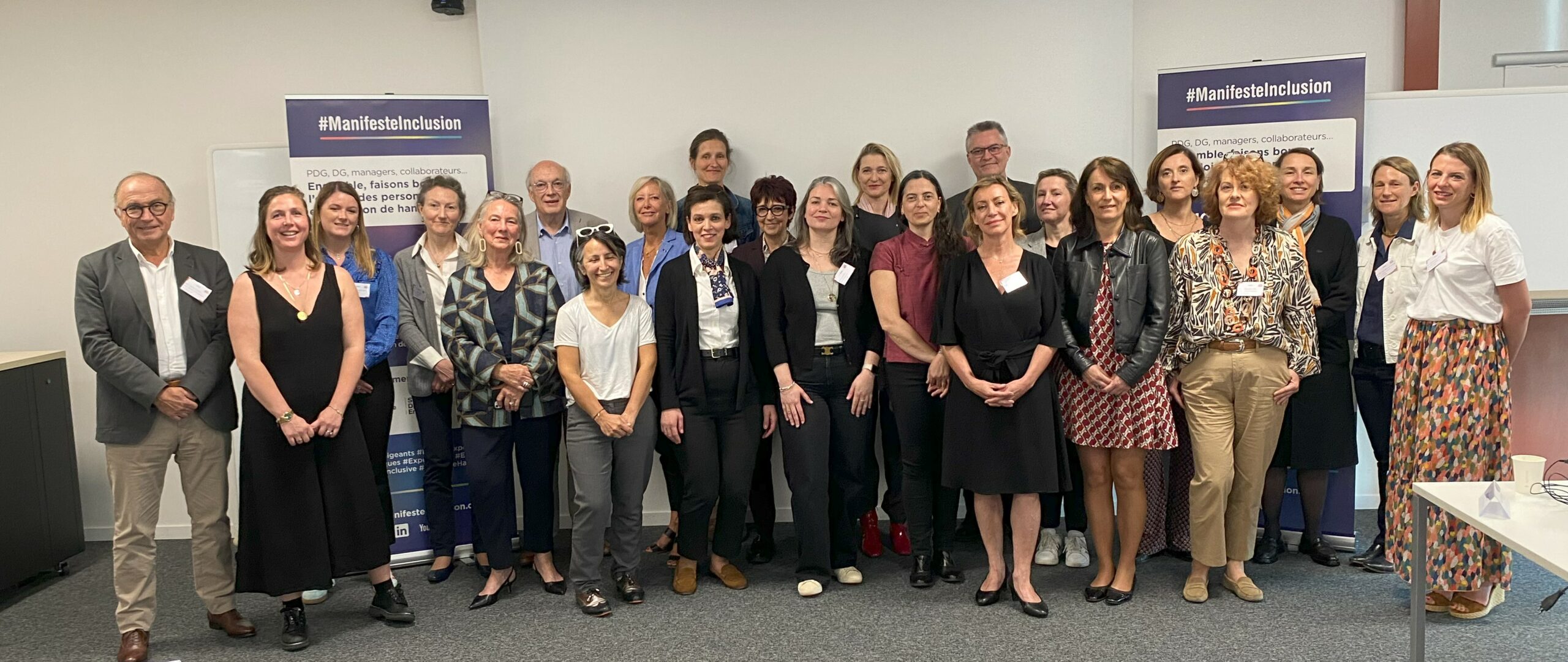Jean-Pierre Letartre et Christian Sanchez, co-présidents du Manifeste Inclusion, Christian Coquart (dentsu), Stéphanie de Maillard (PWC), Fabrice Janvier (Capgemini), Anahi Lafon (L’Oréal), Camille Manceau (Total Energies), Catherine Petrovic (Siemens), Sophie Rouxel (Groupe Les Echos – Le Parisien), Olivier Théophile (LVMH), Johan Titren (The Adecco Group), Philippe Trotin (Microsoft France)